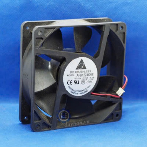 Quạt hút Delta Brushless, mã AFB1224SHE, có điện áp hoạt động 24VDC, cường độ dòng điện 0.75A, kích thước: 120 * 120 * 38mm, , 2 dây, tuổi thọ làm việc cao.